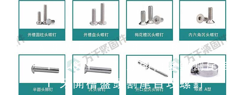 1.機螺釘 2.自攻螺釘 3.鉆尾螺釘 4.墻板釘 5.纖維板釘 6.木螺釘7.六角木螺釘 8.不脫出螺釘 9.組合螺釘 10.微型螺釘 11.家具螺釘 12.電子螺釘 13.鏈帶螺釘頭型:1.六角頭(hexagon head)2.六角頭法蘭面(hexagon head with